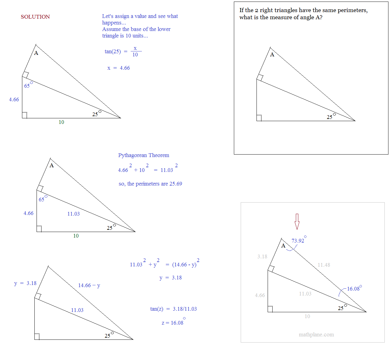 If the 2 right triangles have the same perimeters, then what is the measure of angle A?