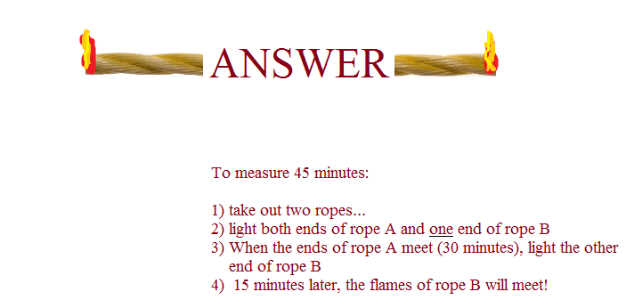 Using logic, you could use the ropes to measure units of time. For example, to measure 30 minutes, you could light each end of a rope simultaneously. (because the burning ends meet halfway after 30 minutes.)