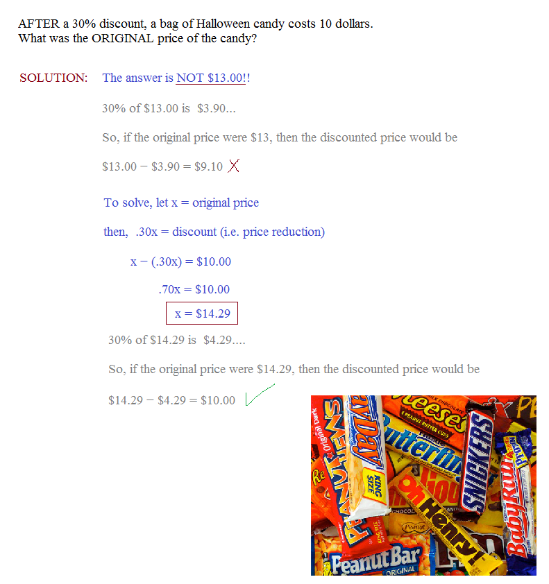 AFTER a 30% discount, a bag of Halloween candy costs $10.00. What was the ORIGINAL price of the candy?