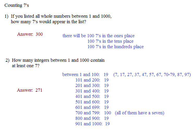 1) If you listed all the whole numbers between 1 and 1000, how many 7's would appear in the list?