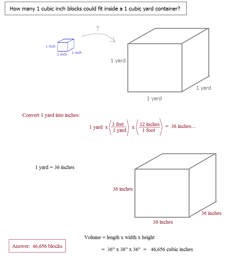 How many 1 cubic inch blocks could fit inside a 1 cubic yard container?
