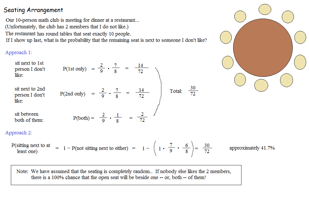 Our 10-person math club is meeting for dinner at a restaurant. (Unfortunately, the club has 2 members that I do not like.). The restaurant has round tables that seat exactly 10 people.