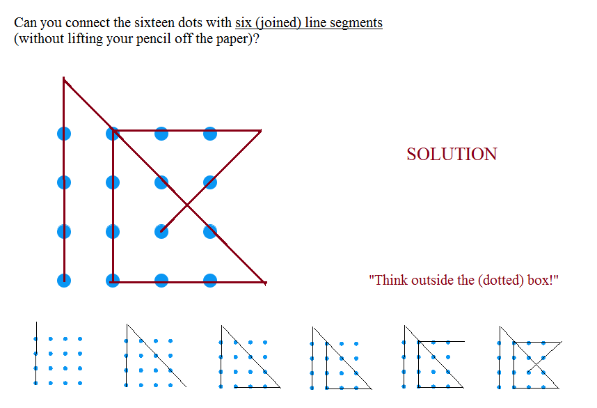 Can you connect the 16 dots with six (joined) line segments (i.e. without lifting your pencil off the paper)?