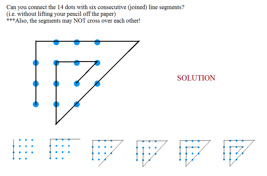 Can you connect the 14 dots with six consecutive (joined) line segments? (i.e. without lifting your pencil off the paper).. ***Also, the segments may NOT cross over each other.