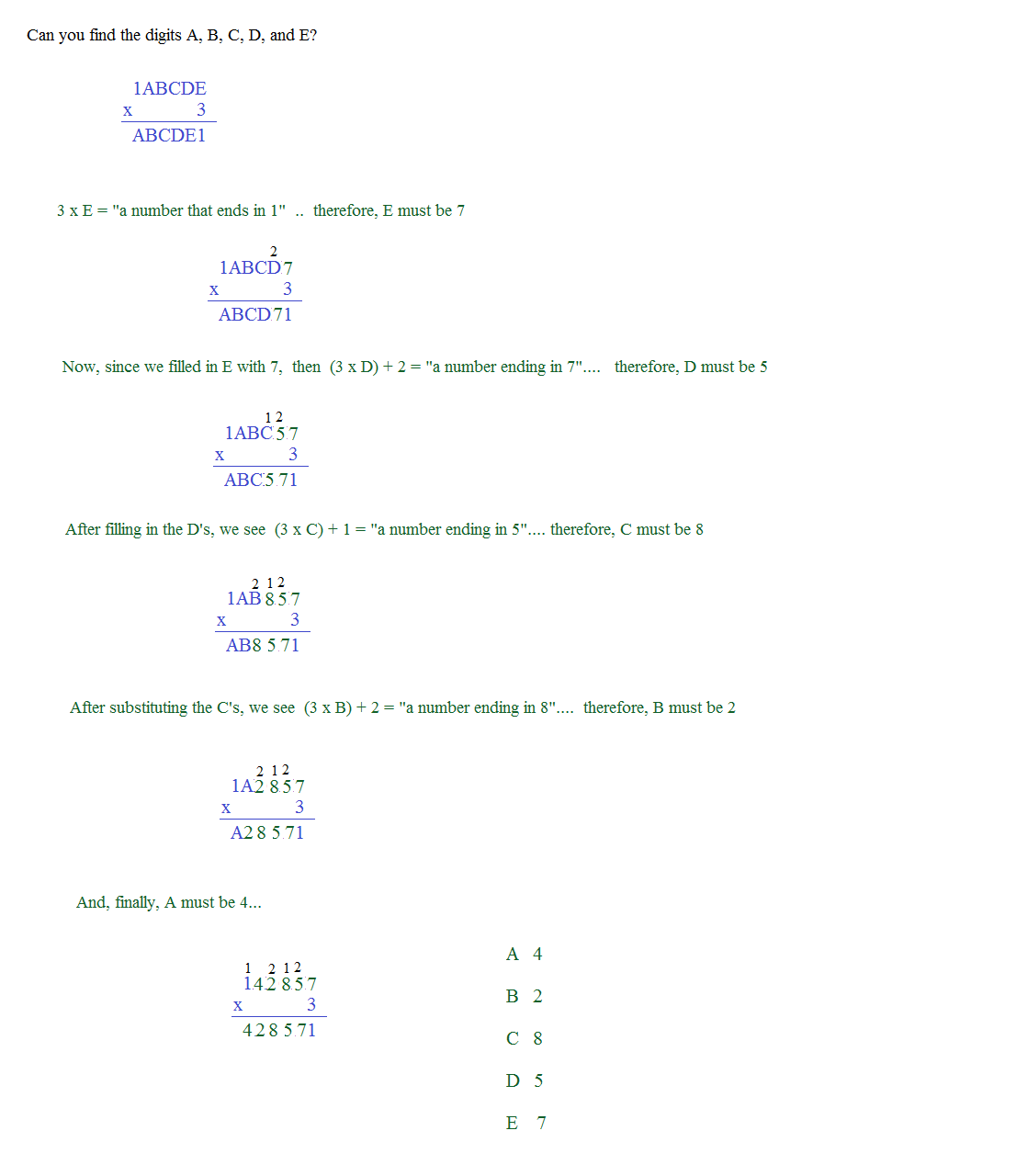 Can you find the digits A, B, C, D, and E?