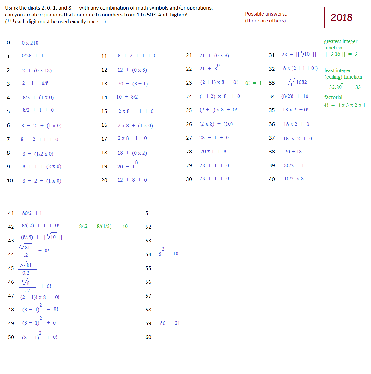 Using the digits 2, 0, 1, and 8 -- with any combination of math symbols and/or operations -- can you create equations that compute to numbers from 1 to 50? And, higher? (Note: Each digit must be used EXACTLY once)