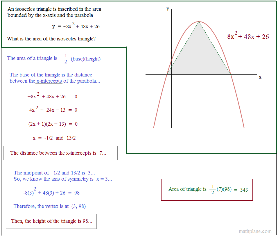 The isosceles triangle is inscribed in the area bounded by the x-axis and parabola.